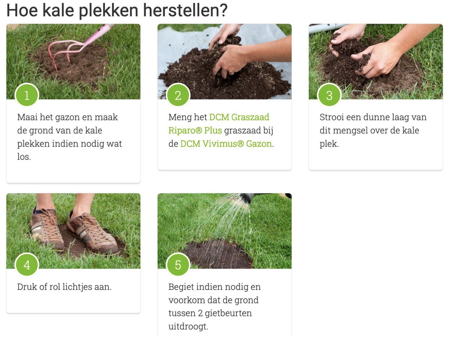 Kale plekken kunnen een gazon behoorlijk ontsieren. Ze zijn vaak het gevolg van een strenge winter, een droge zomer of een te zware belasting van je grasmat. Een verticuteerbeurt laat soms ook haar sporen na, om nog maar te zwijgen van overenthousiaste huisdieren of ongewenste bezoekers zoals mollen. Herstel de kale plekken in je gazon, en voorkom dat ze worden ingenomen door mos of onkruid.