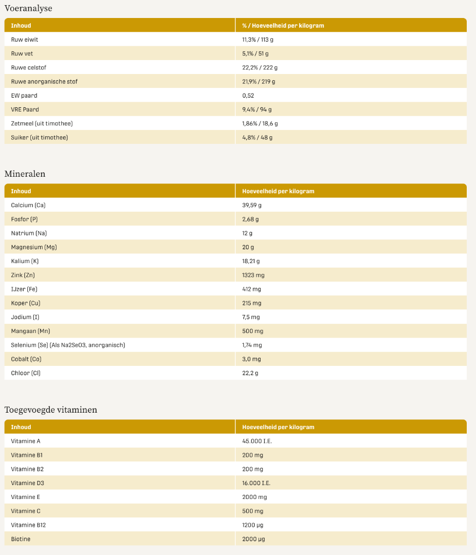 Paarden eten de hele dag door ruwvoer. Maar omdat modern ruwvoer niet zo gevarieerd is als hun natuurlijke menu, komen ze daarmee vitaminen en mineralen tekort. Metazoa FitRight Timothee vult dat gebrek aan. Zonder onnodige toevoegingen en ballaststoffen. Exact wat er nodig is voor een gezond en gelukkig paard.